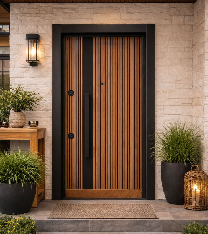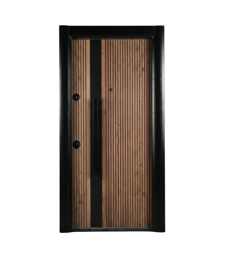 • Vantail renforcé : structure interne en acier avec panneaux décoratifs extérieurs en aspect bois et surfaces métalliques pour un design moderne.