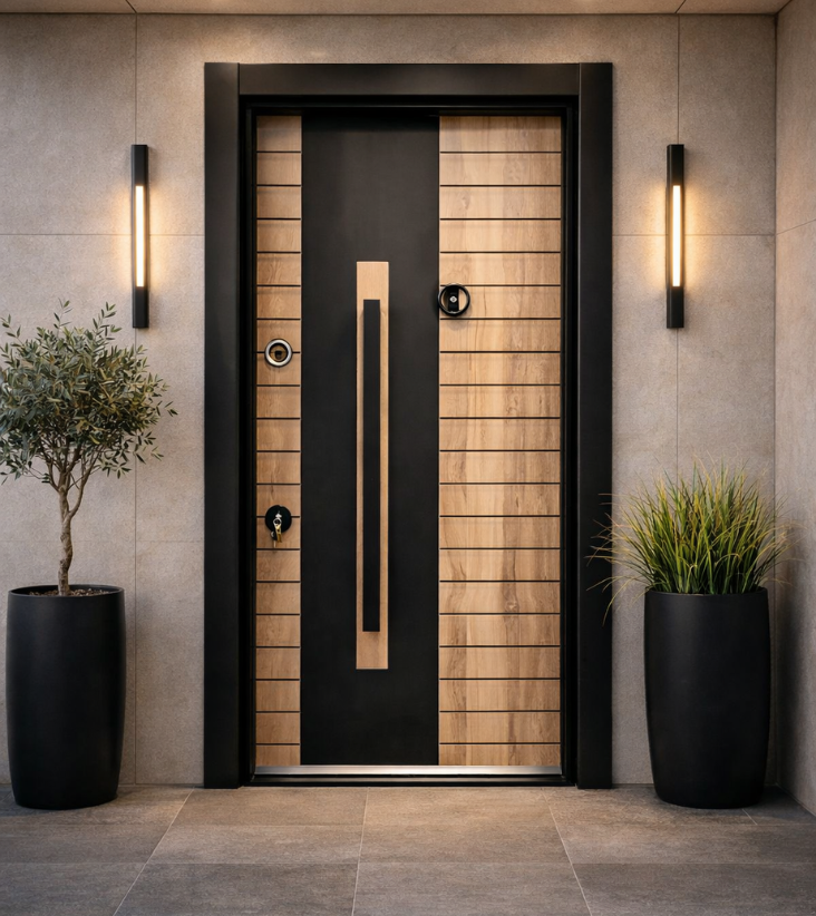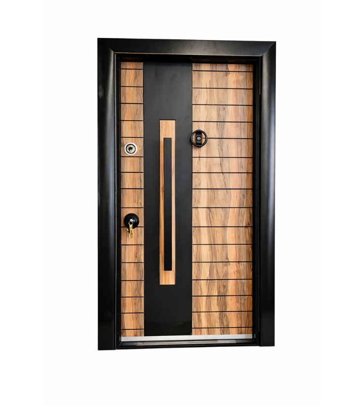 - Vantail renforcé : structure interne en acier avec panneaux décoratifs extérieurs en aspect bois et surfaces métalliques pour un design moderne.